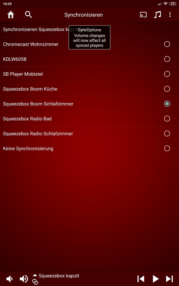 coolio hat geschrieben: Doch, geht super. Die App hat einen haupt-Lautstärkeregler, der regelt normalerweise immer die ganze Gruppe. Individuelle Einstellungen kannst Du in der Playerliste machen, das ist aber eher, um die Lautstärke der geräte untereinander anzupassen, die eigentliche Regelung passt dann meist schon, wenn Du keine ganz extremen Werte hast.