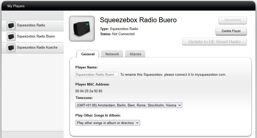 - Unter "Players" finden sich alle drei Geräte - jedoch mit unterschiedlichen Funktionen zu Disconnet oder Update to UE Smart Radio - mal ausgegraut - al nicht. Besonders verblüffend finde ich, dass mein Küchenradio hier immer noch als UE Device geführt wird. Besonders letzteren Punkt würde ich gerne geändert wissen: also wie kann ich mein Küchenradio hier auch wieder als SB Radio geführt bekommen?