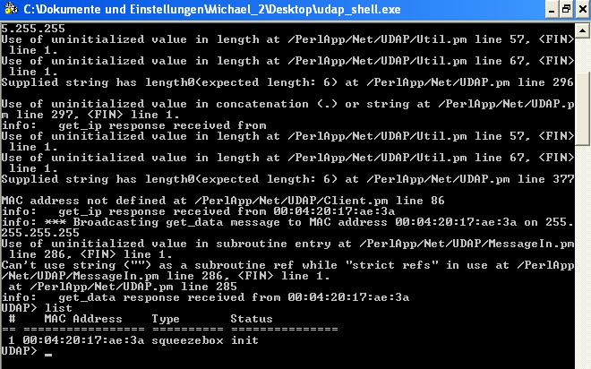 Wenn ich dann mit "udap_shell_1_0_0" ("discover", dann "list") nachsehe, erscheint der Receiver zwar dort, aber im Status ("init"-initialisieren): "Foto 1" im Anhang