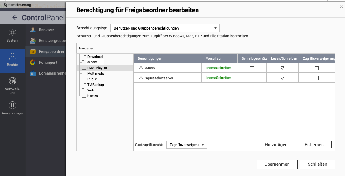 Leider bin ich mit cifs-Freigaben nicht so firm, dass ich Dir da ad hoc helfen könnte, aber Du könntest trotzdem mal den ganzen Dialog von max2Play zeigen, wo man die Freigage zum NAS einrichtet. Eventuell kann man da einen User angeben, den man auf dem QNAP anlegen würde und ihm dort Schreibrechte auf LMS_Playlist geben. Allerdings sollte das nicht für den kompletten Multimedia-Ordner, sondern nur für den einen Unterordner gelten.