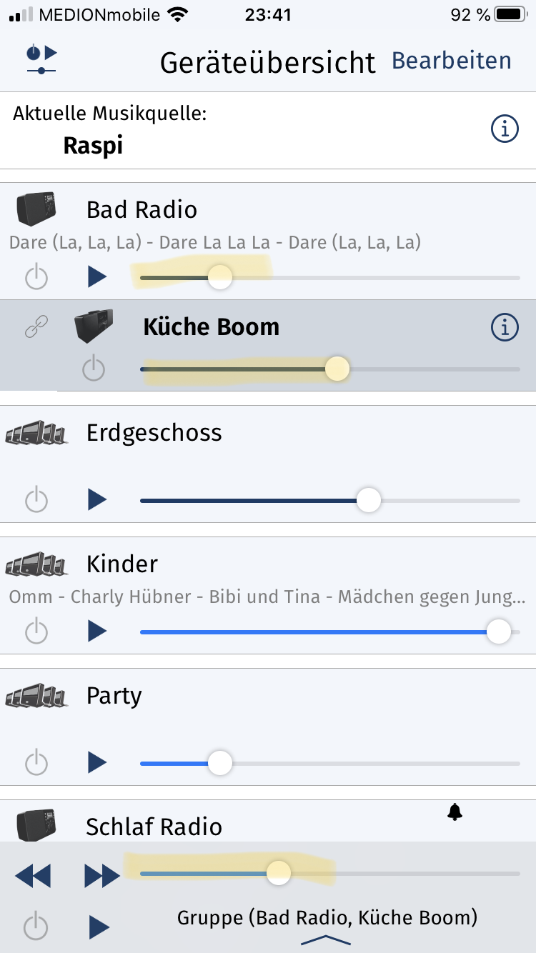 coolio hat geschrieben: Doch, geht super. Die App hat einen haupt-Lautstärkeregler, der regelt normalerweise immer die ganze Gruppe. Individuelle Einstellungen kannst Du in der Playerliste machen, das ist aber eher, um die Lautstärke der geräte untereinander anzupassen, die eigentliche Regelung passt dann meist schon, wenn Du keine ganz extremen Werte hast.