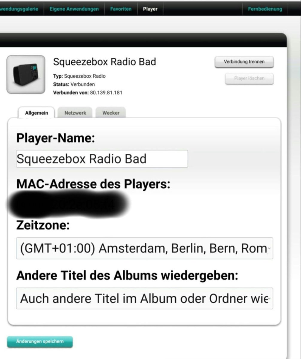 Nach dem Reset hat das Radio auch immer sehr gut funktioniert. Nun habe ich bemerkt, dass sich das Radio noch immerer gerne noch in Mysqueezebox anmeldet. Dennoch ist das Radio dann dort angemeldet und gleichzeitig im Server, sodass ich noch immer eigene Musik abspielen kann. Ein Wechsel komplett zu Mysqueezebox ist jedoch noch immer möglich. Dennoch bleibt er noch immer dauerhaft bei Mysqueezebox angemeldet. (selbst, wenn ich das Radio komplett ausschalte, wird mir noch immer angezeigt, dass es verbunden ist/siehe Anhang)