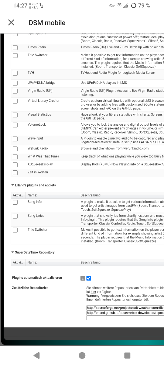 Ich habe in den Einstellungen für die Plugins einen Eintrag für zusätzliche Repositories eingefügt: https://erland.github.io/squeezebox-dow ... latest.xml und mal ein Kästchen angehakt und schon war der Plugin Custom Clock Helper (v2.11.94) von Erland zu sehen