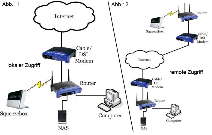 Dazu muss meine Touch natürlich den Server ansprechen können, so wie's auch zuhause läuft, nur dass sich nun Server und Squeezebox nicht mehr im gleichen lokalen Netz befinden. Die Touch muss also nun ("von Aussen") meinen Routers ansprechen, der das auf den SBS weiterleitet, aber wie geht das? Im Squeezebox-WIKI hab ich auch gelesen, dass das geht.