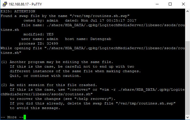 Ich bekomme immer die Fehlermeldung, dass eine Swap File gefunden wurde und ich die originale routines.sh nicht bearbeiten kann. Hat jemand einen Tipp oder Lösungsvorschlag? Ich möchte so gerne den LMS auf meinem Qnap NAS auf den neusten Stand bringen.