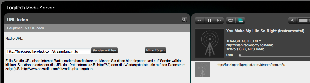 Im Webinterface des LMS gibt es unter "Radio" den Punkt "URL laden". Da kommt die URL rein: Und die URL der Quelle wird auch angezeigt. Allerdings eben die, die von der Sendestation (wie man in meinem zweiten Screenshot sehen kann) bzw. Provider gesendet wird. Und man kann ebenda erkennen, dass die angezeigte und die eingegebene URL nicht an jeder Stelle übereinstimmen. Da kann die klügste Box nichts machen.