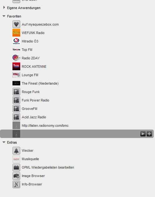 Leider werden im Player (und auch im LMS) keine Senderlogos angezeigt. Damit könnte ich noch leben, aber ganz ohne irgendeine Anzeige welcher Sender da spielt (wie bei 54-funk-...) ist das schon arg dürftig. Entweder Senderlogo oder vernünftiger Favoritenname wäre schon schön.