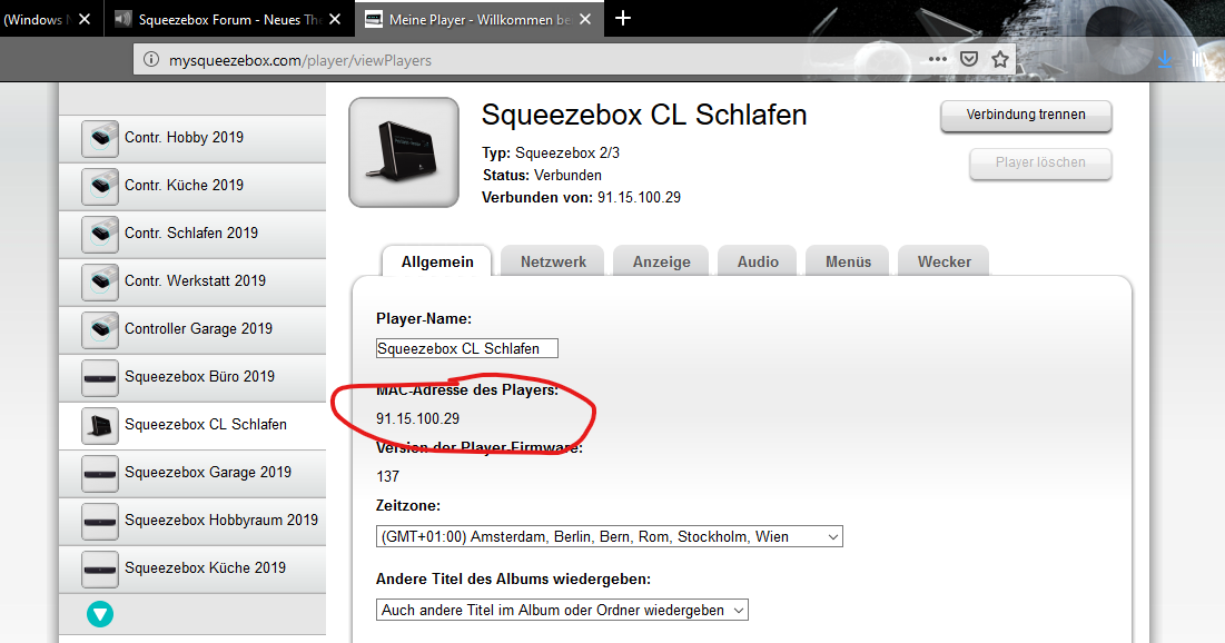 Hallo, ich habe diverse Squeezeboxen in der Wohnung, alle mit www.mysqueezecox.com registriert. Es tauchen auch die Player in der Liste auf. Jetzt aber meldet sich die Squeezebox Classic nicht mehr mit der MAC Adresse an, sondern mit der IP Adresse des Router (die zugewiesene Telekom IP) wie gibt es das bzw. wie kann ich das wieder ändern?? Denn die Telekom Adresse ändert sich ja, und die Box ist dann unereeichbar. Factory Reset und im Konto neu angemeldet hab ich schon. meine Anderen Player / Transporter laufen alle einwandfrei! Bitte um Hilfe!