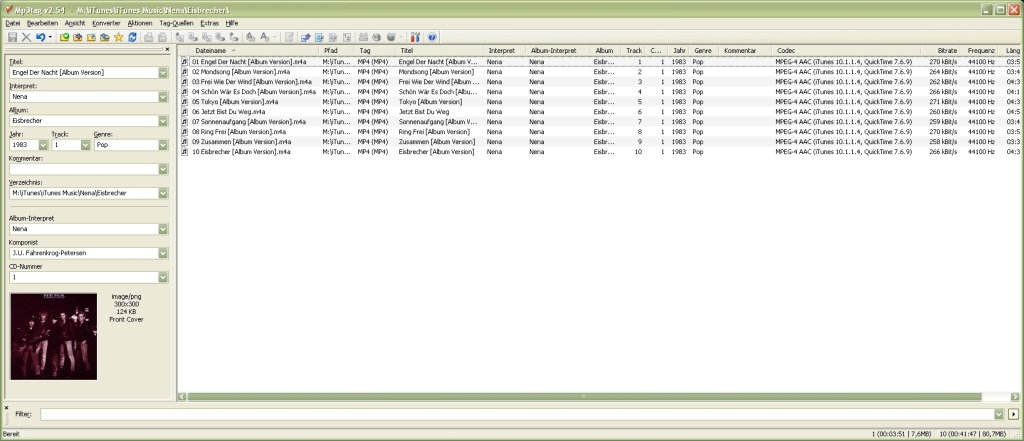 Z.B. findet er Meat Loaf und auch Nena nicht. Wobei es bei Nena so ist, dass wenn Nena mit einem anderen Künstler zusammen ein Song singt, dann steht der unter Interpreten. Nur eben dann nicht, wenn Nena was alleine macht. Ich habe schon die CDs neu importiert (iTunes Import-Einstellungen sind für die komplette Mediathek gleich: 256kBit/s, 44.100kHz, VBR, für MMX/SSE2 optimiert), aber das hat nichts geändert, Nena und auch Meat Loaf tauchen einfach in Interpreten nicht auf.