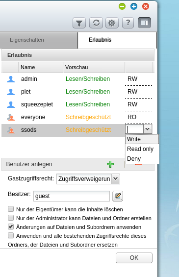 Doch, Ordnerrechte habe ich auch als Screenshot dabei gehabt. Ich finde hier aber bloß read, write und deny. Bei dir steht noch Zugriffsrecht, das habe ich hier gar nicht.coolio hat geschrieben:Was Du uns hier zeigst, sind immer nur die Rechte für die Dateien, nie die für den Ordner, in dem die Dateien sind.
