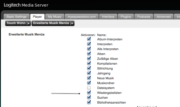 Ich kann unter PLAYER in EINSTELLUNGEN des LMS auf meinem NAS keine entsprechende Einstellmöglichkeiten finden.karlek hat geschrieben:Du kannst auf der Einstellungsseite des LMS unter Player einstellen, welche Ansichten erscheinen sollen. Wahrscheinlich muss die Wiedergabeliste noch angekreuzt werden.