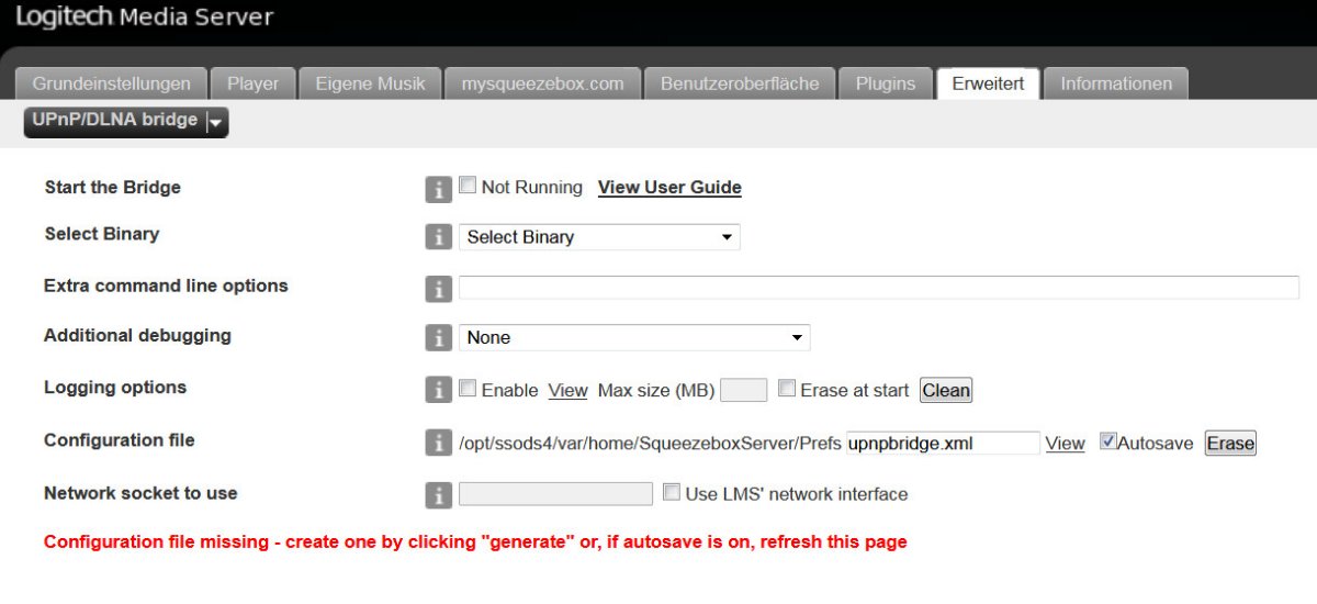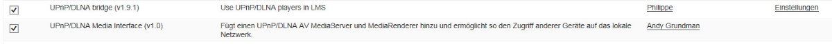 wird bei mir nicht aufgelistet. (Vielleicht weil ich den LMS 7.7.2 verwende?) Unter den UPnP/DNLA bridge Einstellungen habe ich eine rote Fehlermeldung gefunden.