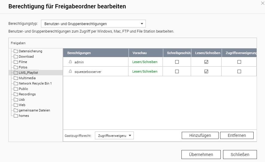 Leider bin ich mit cifs-Freigaben nicht so firm, dass ich Dir da ad hoc helfen könnte, aber Du könntest trotzdem mal den ganzen Dialog von max2Play zeigen, wo man die Freigage zum NAS einrichtet. Eventuell kann man da einen User angeben, den man auf dem QNAP anlegen würde und ihm dort Schreibrechte auf LMS_Playlist geben. Allerdings sollte das nicht für den kompletten Multimedia-Ordner, sondern nur für den einen Unterordner gelten.