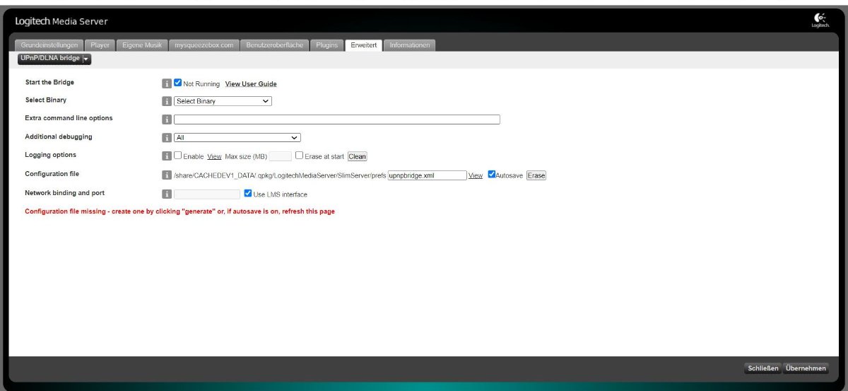 Wie ich erwartet habe, existiert keine upnpbridge.xml Datei im angegebenen Verzeichnis: /share/CACHEDEV1_DATA/.qpkg/LogitechMediaServer/SlimServer/prefs