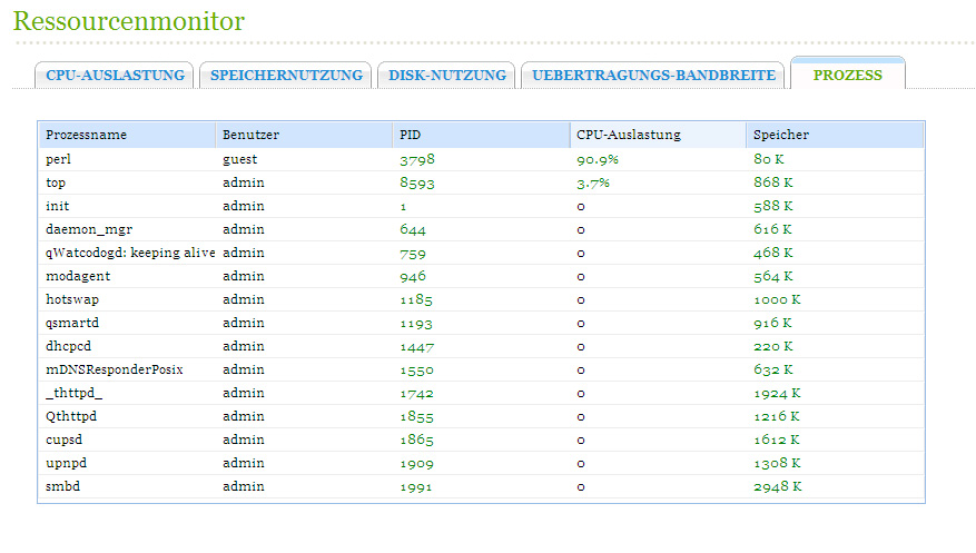 Ich habe mal versucht, das Problem so weit wie möglich zu identifizieren: Beim Zugriff über eine Squeezebox schnellt die CPU-Auslastung in die Höhe und bleibt dauerhaft bei 100%. Ein Prozess namens "mysqld" vom Benutzer "guest" belegt dauerhaft über 90%. Ich habe hier aus einigen Beiträgen raus gelesen, dass der Server sehr viel Arbeitsspeicher benötigt. Hier kann ich aber keine Probleme erkennen, denn es wird nicht einmal 25% des Arbeitsspeichers belegt.