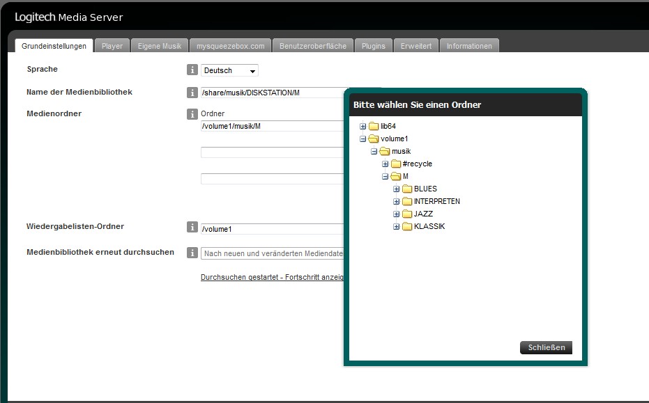 leider ist es so, dass, wenn ich in der squeezebox -> einstellungen -> grundeinstellungen diesen zweiten pfad (der qnap) einrichten will (mit "Durchsuchen") dann zeigt er den ordner (musik-qnap) nicht an. ich kann ihn nicht auswählen. wenn ich es manuell versuche, dann geht der eingetragene pfad nach "speichern" wieder weg.