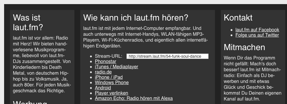 https://laut.fm/54-funk-soul-dance in die Internetradiosuche der Touch eingegeben, die Adresse die mir am PC angezeigt wird, wenn ich diesem Stream zuhöre. Den hat die Touch aber nicht gefunden. Wo oder wie müsste ich eine direkte Stream-URL eingeben?