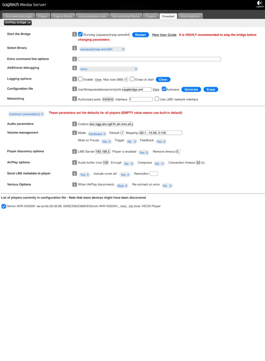 Airplay Plugin. Auf einem Raspberry Pi ist der LMS v 8.2.0 installiert. Das AirPlay Plugin soll einen Denon einbinden. Dies hat in der Vergangenheit auch gut funktioniert. Ich vermute es hängt evtl. mit den Updates vom Denon Receiver zusammen. Das Problem: