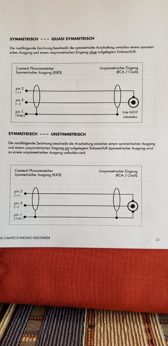 ich habe meinen Phonoverstärker quasisymmetrisch angeschlossen, so wie in den Bildern im Anhang. Zumindest in meinem Setup wirkt sich das positiva auf den Klang aus, wobei keine Welten dazwischen liegen ;-)
