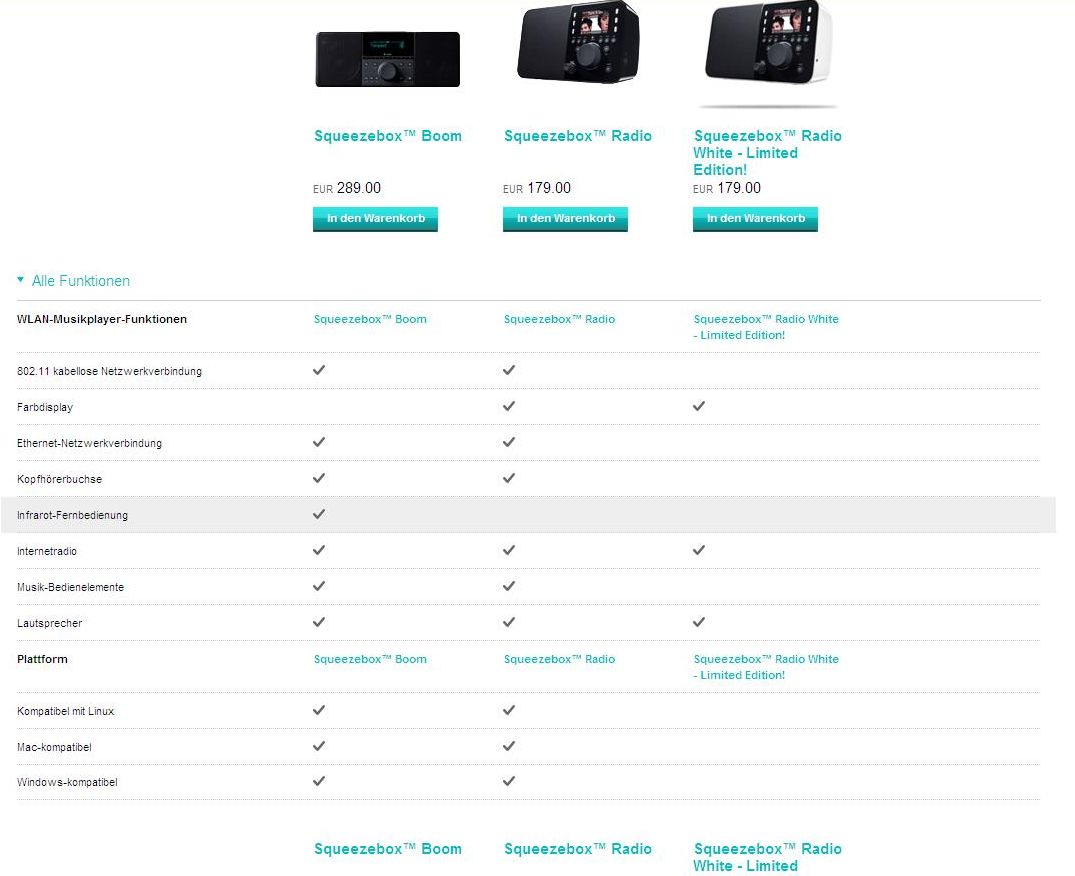 Also ich habe mal wieder etwas seltsames bei Logitech entdeckt. Geht man auf die Homepage und macht einen Vergleich dann hat das weiße Radio weder LAN noch WLAN. In den Beschreibungen ist es aber drin – logisch! Zum anderen gibt es auf der Homepage des Radios, egal ob weiß oder schwarz, ein Bild wo eine kompakte Box gezeigt wird. Schaut man dann bei den Daten scheint die weiße Box tatsächlich nicht so tief zu sein. Stimmt das? Auf der Tabelle ist es so mager ausgestattet, dass es nicht einmal Bedienelemente hat.
